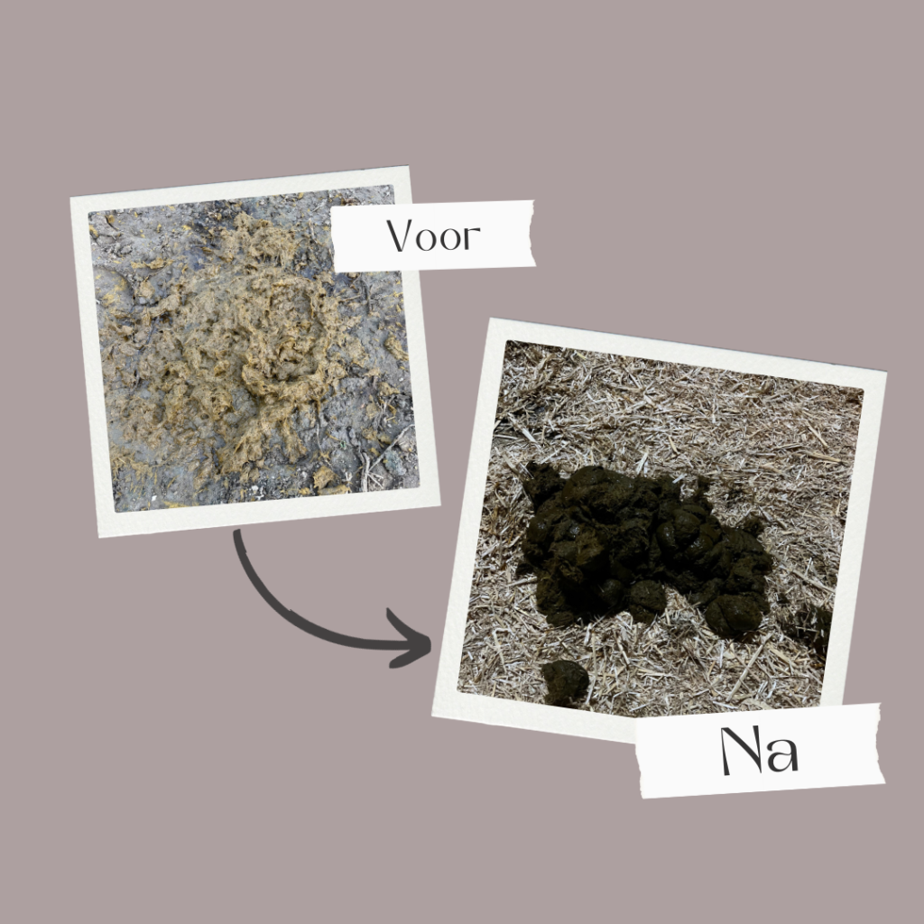 Dit supplement komt in een handig emmertje (navulverpakkingen verkrijgbaar voor de duurzaamheid) met maatbekertje. De pellets lijken op voerbrokjes, waardoor ze gemakkelijk te doseren zijn en ze ruiken neutraal. In de meest ideale situatie verdeel je de dagelijkse dosering over twee voerbeurten. Lukt dit niet, dan kun je de dosering ook in één keer voeren, maar dat kan een goede werking iets langer uitblijven. De altijd spannende test bij supplementen of voer is Noblesse haar smaaktest. Want voor een paard dat zo geobsedeerd is met eten, kan ze soms ontiegelijk moeilijk en kieskeurig doen. Maar gelukkig, de neus verdween tevreden in de voeremmer (ook zonder andere brokjes of voer erdoor!). Na de smaaktest, was het natuurlijk wachten op het resultaat: of en hoe er gemest wordt. Na twee dagen ging Noblesse haar mest van heel slap, naar ietsjes steviger. Ook merkte ik dat ze minder gas in haar buik had. Resultaat dus! Helaas was de kwaliteit van het ruwvoer op dat moment zo slecht, dat het niet helemaal optimaal werd, zelfs niet met een goed supplement. Daarom heb ik na twee weken gebruik een pauze ingelast, omdat het product zo niet goed tot z’n recht kwam en ik het niet goed kon testen.